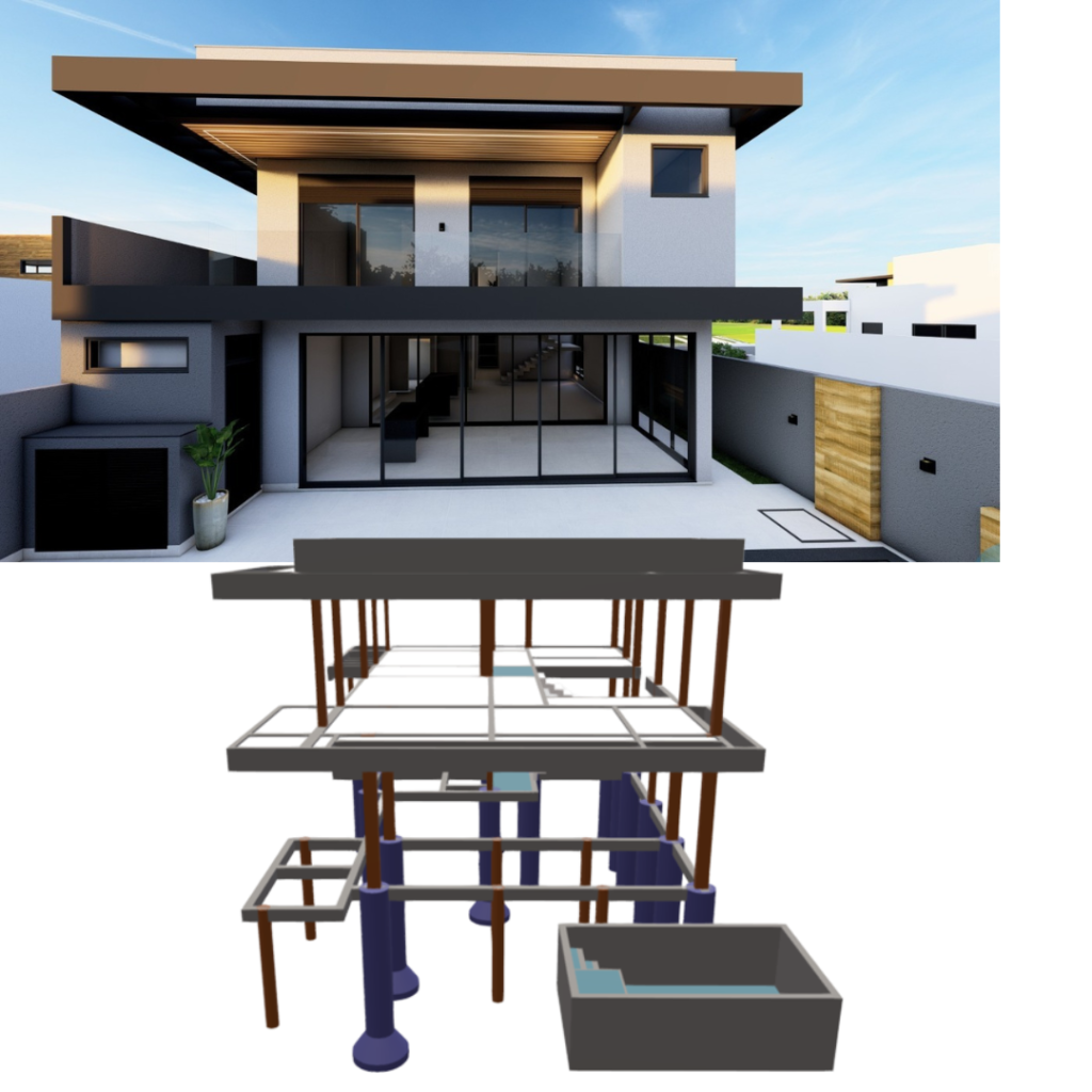 O projeto arquitetônico conta com grandes vão no fundo da residência, com paredes do térreo totalmente desalinhadas com as paredes do pavimento superior. E o diferencial desta residência é a escada plissada auto-portante, ou seja, uma escada que não tem apoio no seu patamar.