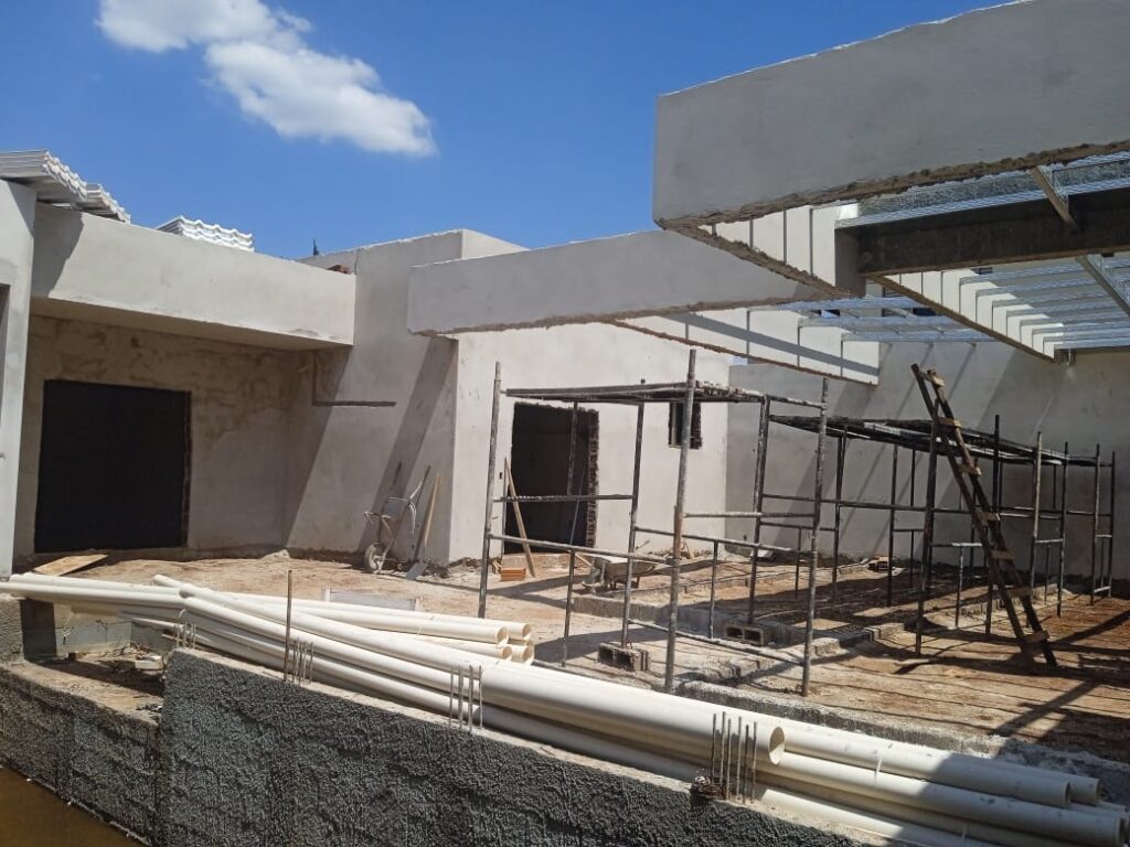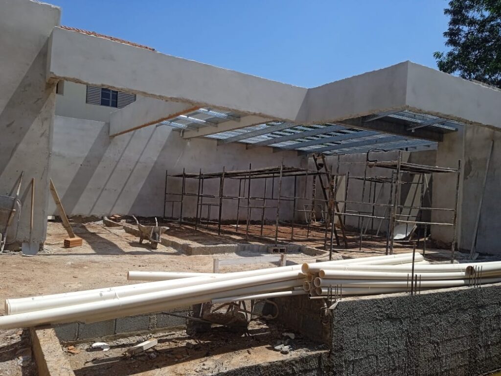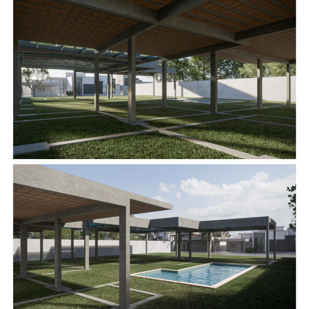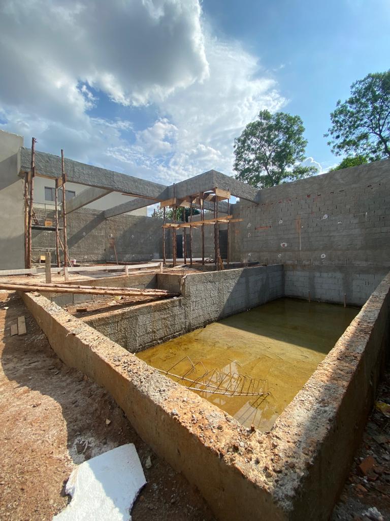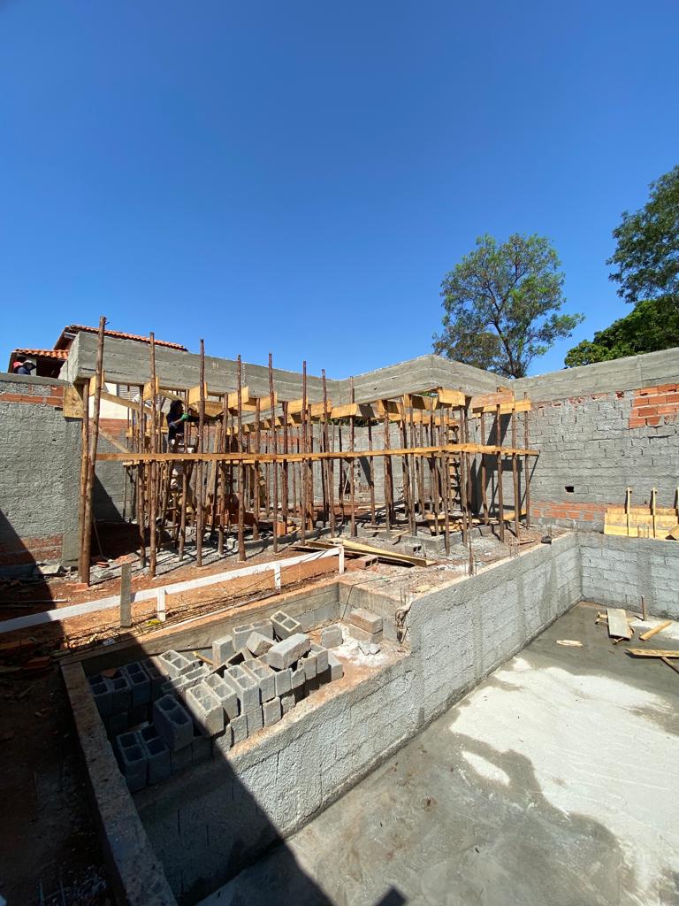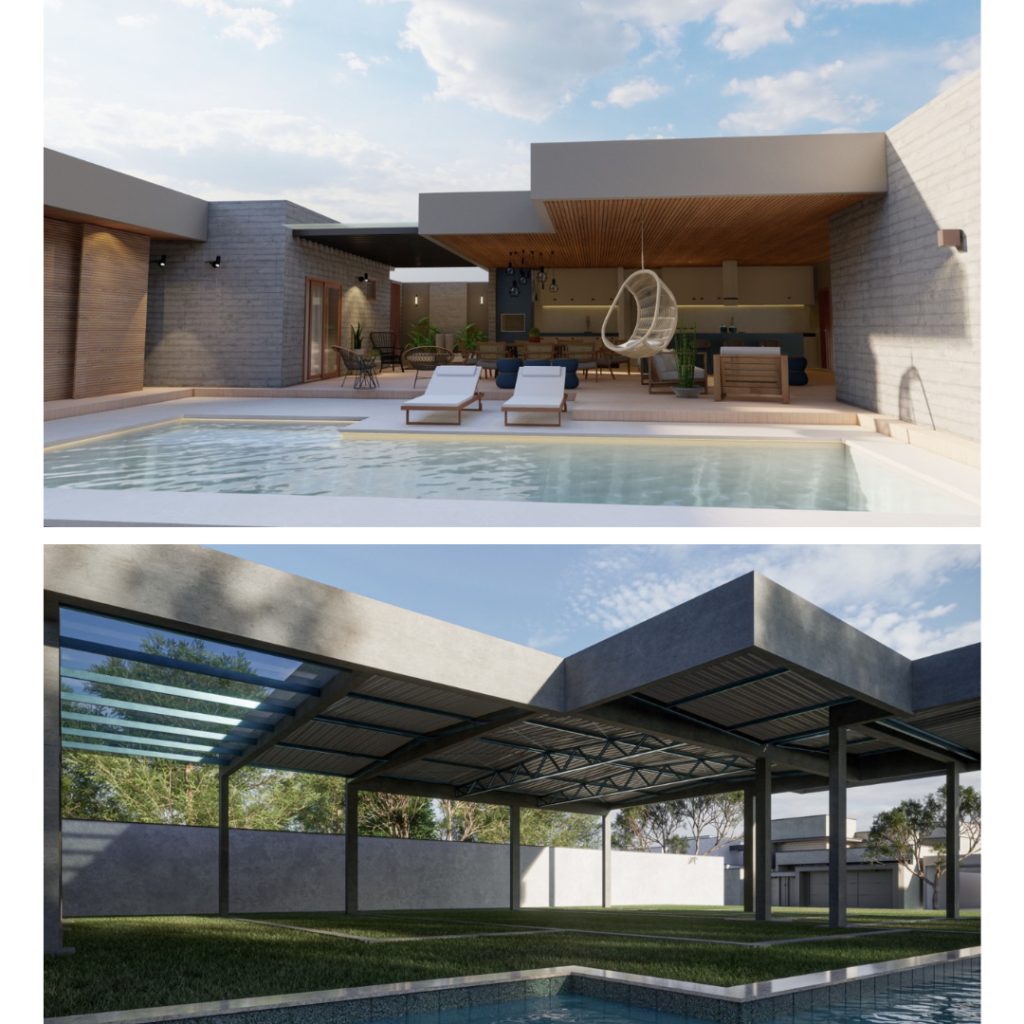 A residência foi desenvolvida com uma ampla área de lazer, os cômodos da residência foram utilizado lajes treliçada, já na área de lazer utilizamos estrutura de concreto armado (viga com 10 metros de vão livre), porem a cobertura foi feita em estrutura metálica (tesoura com vão de 8 metros) e que será revestida com teto de madeira.