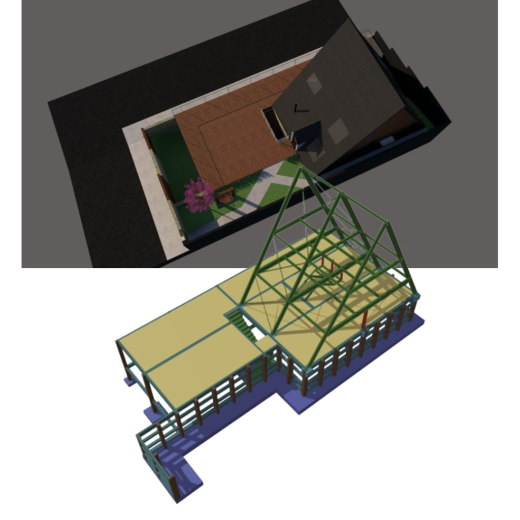 O chalé será feito em estruturas metálicas, a base desse chalé inicialmente seria feito um aterro em toda área, porém visando o melhor aproveitamento e para evitar possíveis patologias no piso por conta de dilatação, foi proposto para a proprietária fazer uma laje piso e aproveitar a parte de baixo, que posteriormente a proprietária irá utilizar como loja/depósito. Foi nos fornecido as cargas da estrutura metálica para considera-las na estrutura de concreto armado, na garagem conta com uma viga com 9m de vão livre e uma carga de 350kg/m² sobre a laje, pois em dias de festividade possa ter um grande fluxo de pessoas… Além de contar com um muro de contenção de aproximadamente 3,20m de altura.