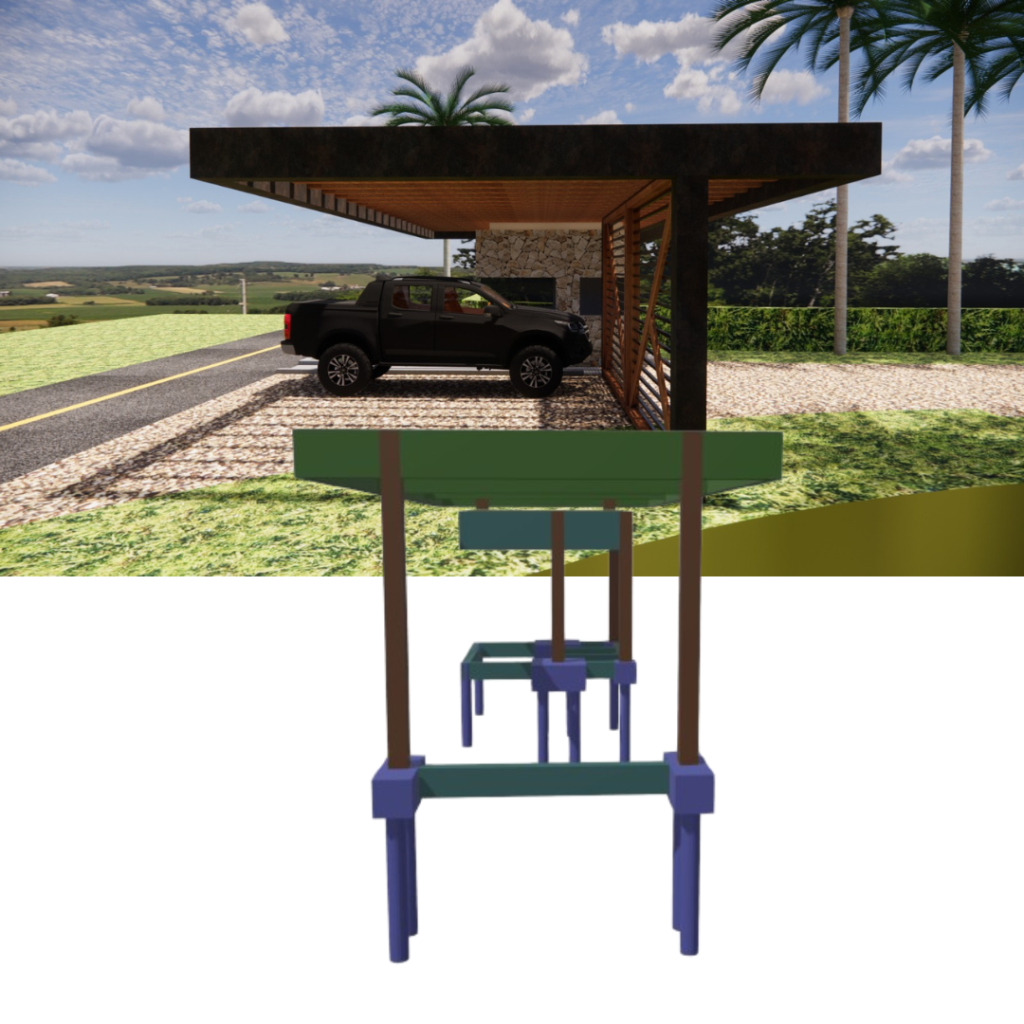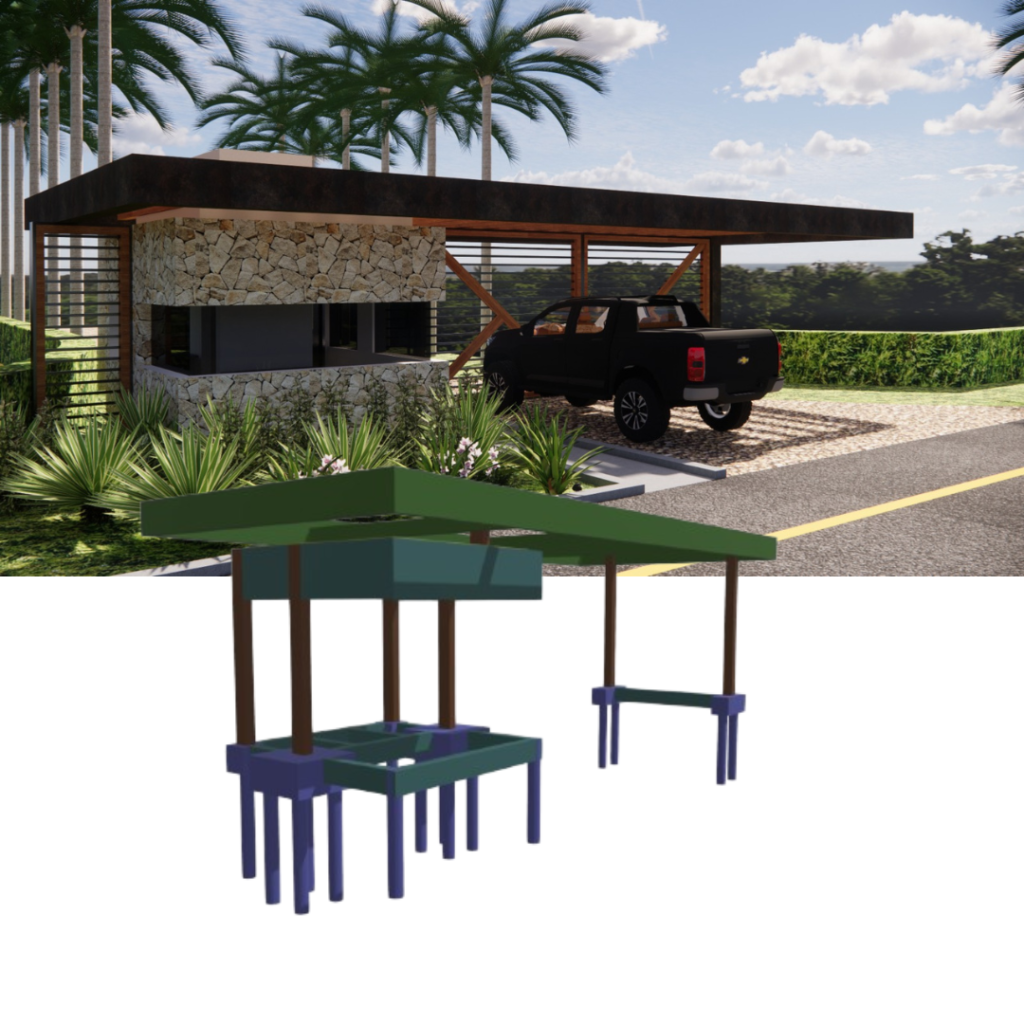 Na cobertura utilizamos perfis metálicos para podermos atender somente o caimento do telhado, assim temos uma viga de 60cm de altura vencendo um vão de 12 metros. Já a estrutura da guarita será feita com blocos de concreto afim de ter uma segurança para os colaboradores que trabalharam no local. Foi acrescentado mais 1 pilar na lateral da cobertura afim de trazer uma economia para a obra.