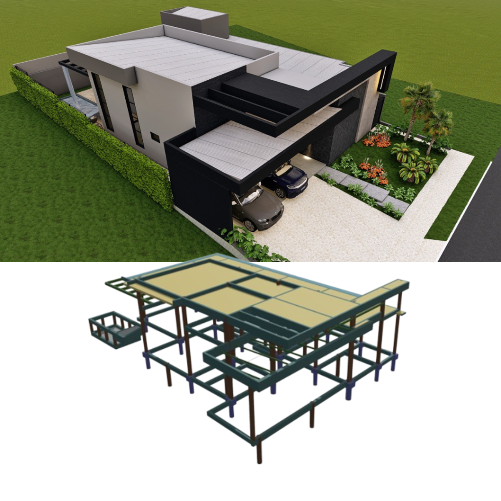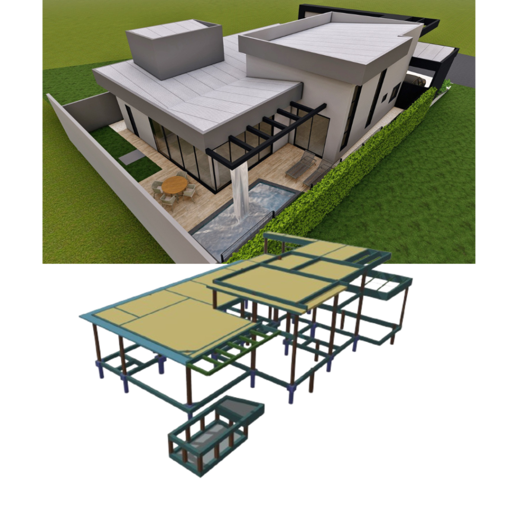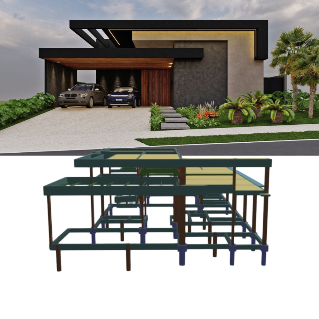 O projeto arquitetônico conta com um balanço de 5 metros na fachada. Temos um elemento na fachada onde resolvemos com estrutura metálica, além de um pergolado/cascata da piscina que também foi desenvolvido em estrutura metálica.