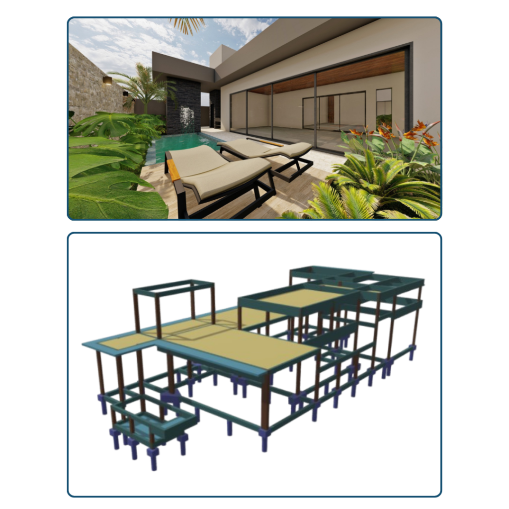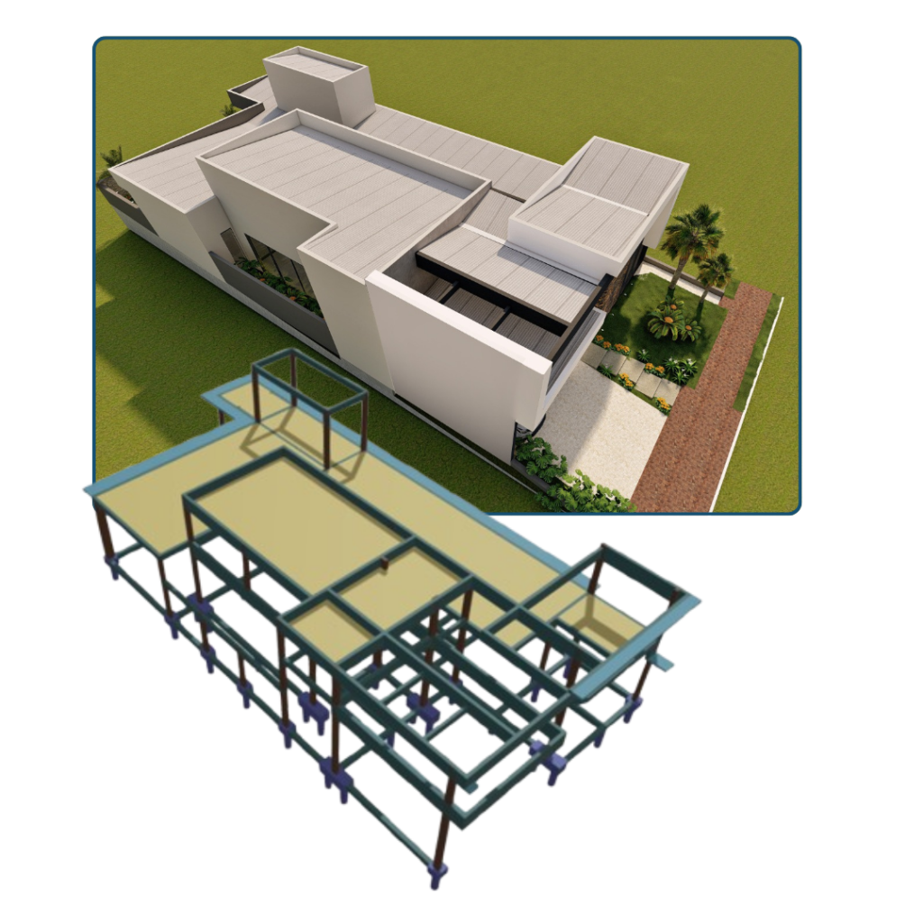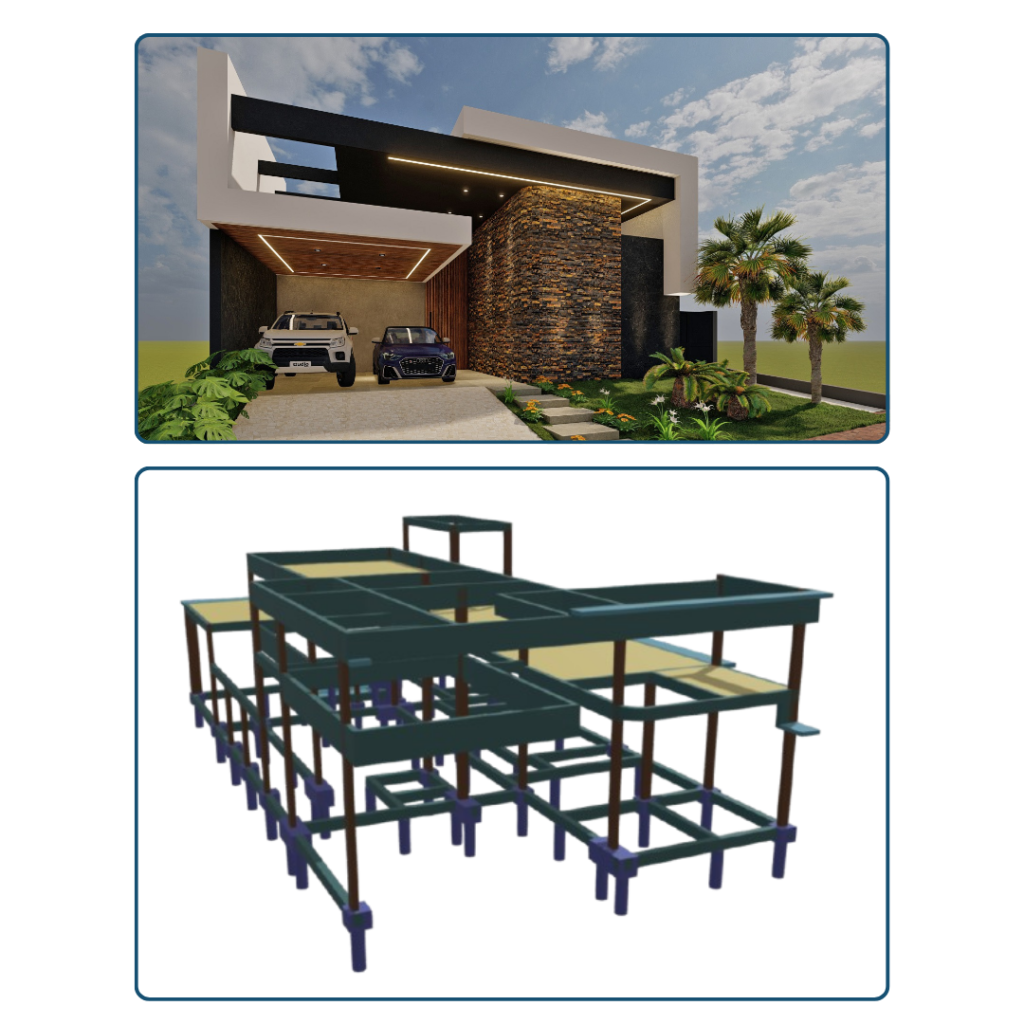 O projeto arquitetônico conta com balanço de 5 metros na fachada, além de uma arquitetura arrojada com grandes vão e área amplas. conseguimos elaborar um projeto econômico e seguro para atender toda a arquitetura.