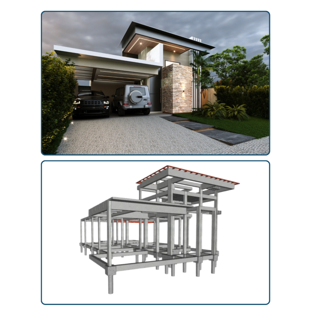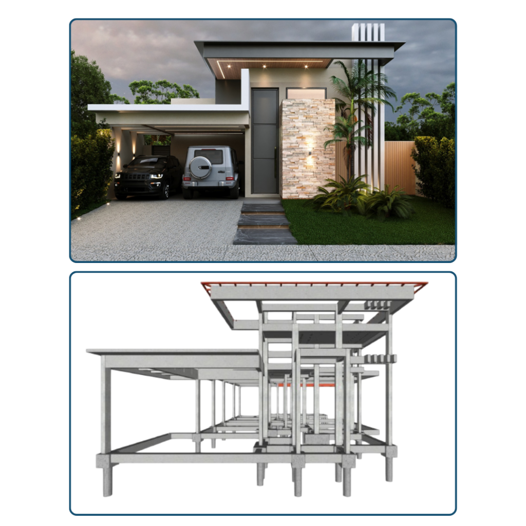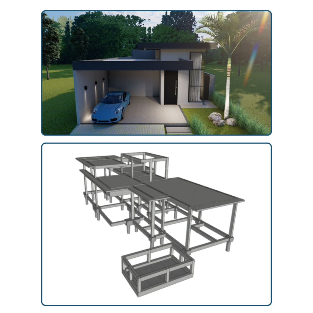 O projeto arquitetônico conta com uma arquitetura moderna e uma fachada com vigas em balanço, além de detalhes de um pergolado em estrutura metálica.